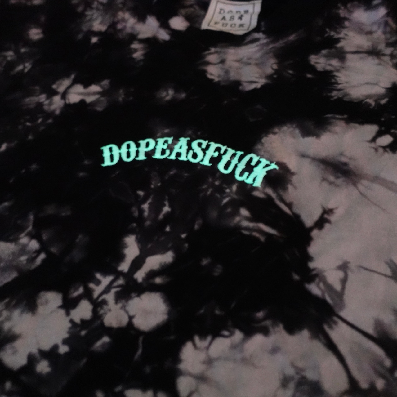 この商品は暗闇で光る、Fluorescence(蛍光)のEmbroider(刺繍)を用いてDOPEASFUCKの文字が描かれています‼︎