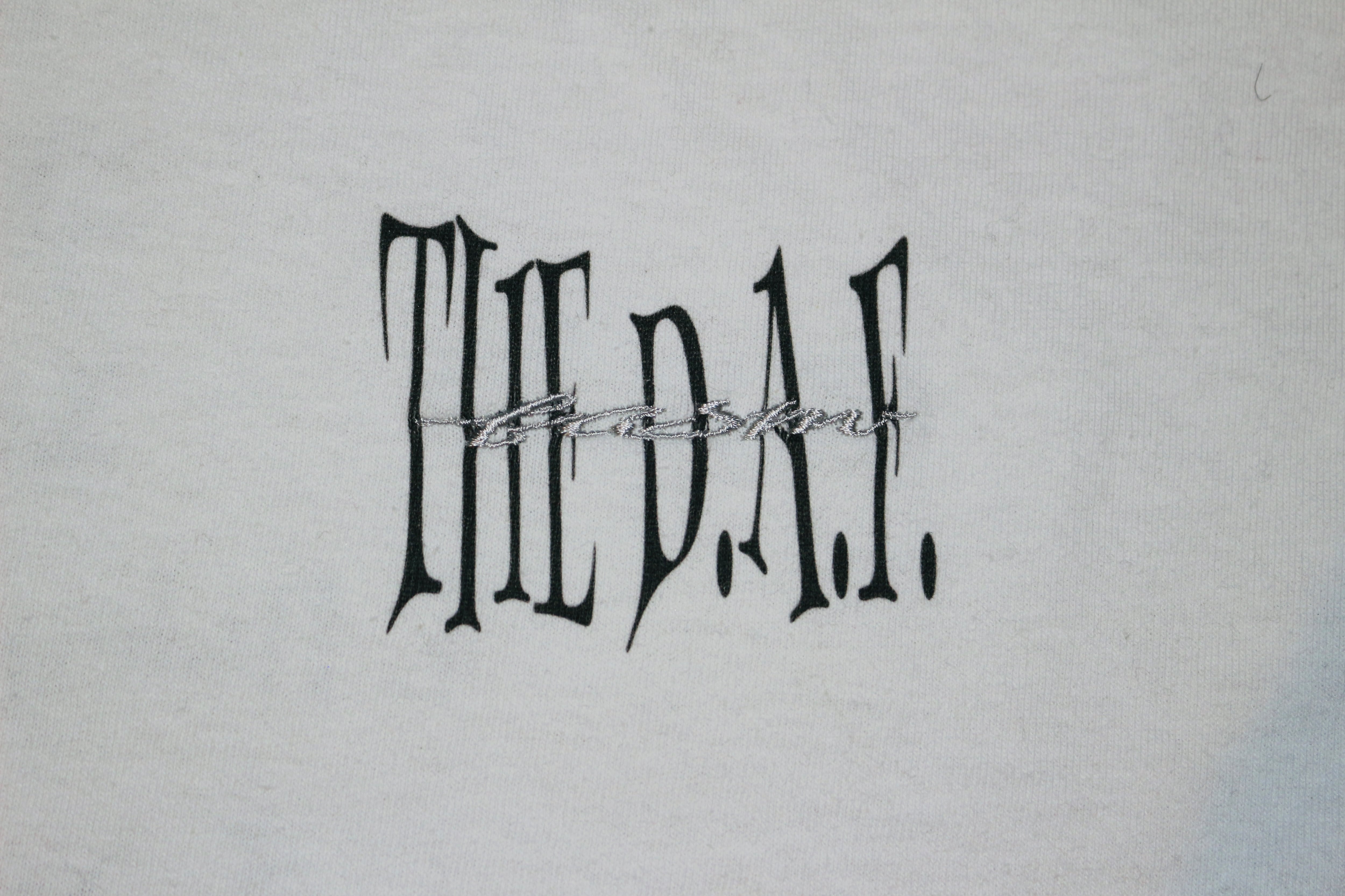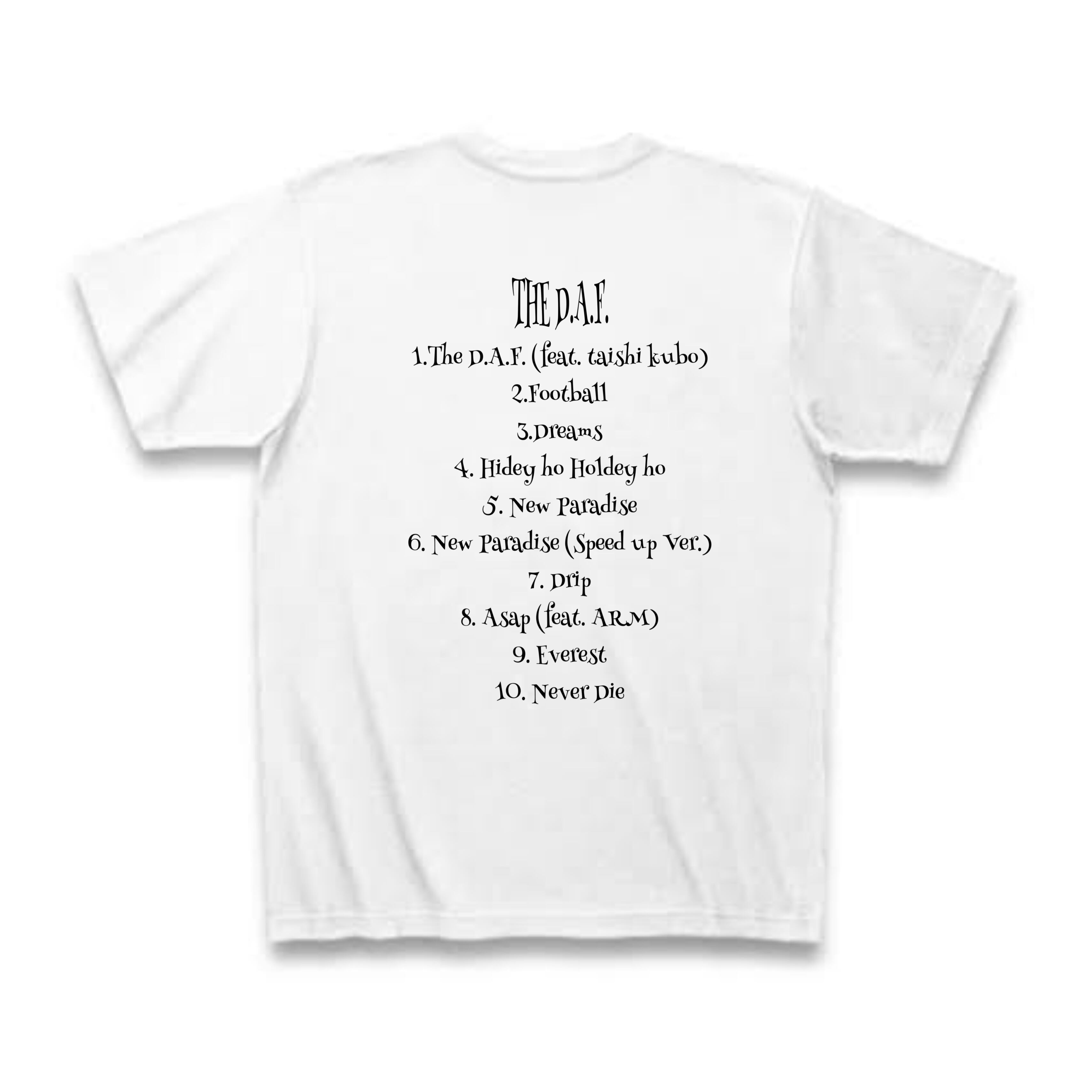 FASM 1st Album "THE D.A.F."のOriginal T-shirts。THE D.A.F.のペイントデザインの上にFASMの刺繍が施されている。音楽だけでなくファッションや様々なカルチャーを通してFASM, DOPE AS FUCKを感じていただきたい。