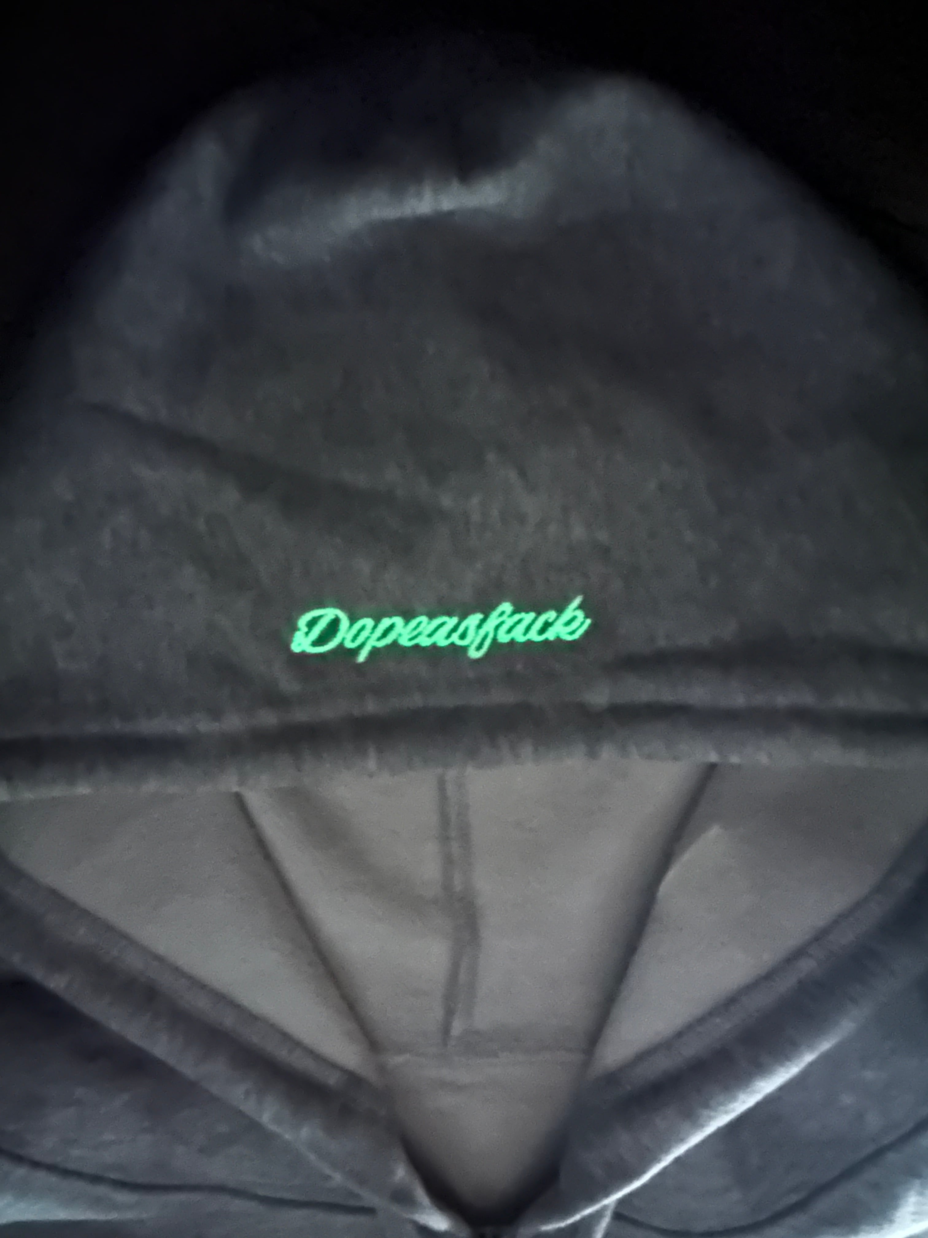 左胸にはDafから美しい花が咲く様子が描かれ、フード真ん中には蓄光糸でDopeasfuckが描かれている。